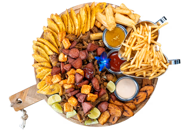Beef, chicken, pork, cheese, and salami. Served with a choice of fries or plantains. Carne de res, pollo, cerdo, queso y salami. Servido con papas fritas o tostones.