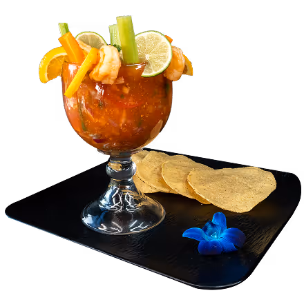 Cancun style shrimp cocktail with fresh ingredients. Traditionally style also available. Cóctel de camarones al estilo Cancún con ingredientes frescos, disponible también en estilo tradicional.