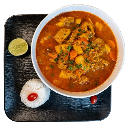 Caribbean beef stew with a variety of starchy vegetables, chicken and meats served with a side of steamed rice. Estofado de carne caribeña con una variedad de verduras, pollo y carnes. Servido con arroz blanco.