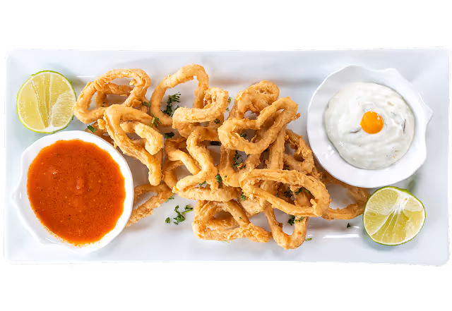 Caribbean reef squid fried to perfection and served with marinara sauce or tarter sauce. Calamares de arrecife del caribe fritos a la perfección. Servido con salsa marinara o salsa tartara.