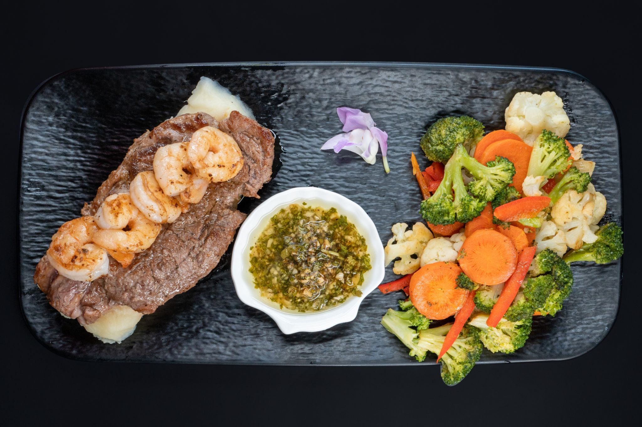 The Surf & Turf pairs a 12 oz New York strip steak with jumbo shrimp and chimichurri sauce, served alongside mashed potatoes and steamed broccoli. It’s a combination of land and sea that delivers both richness and balance.
