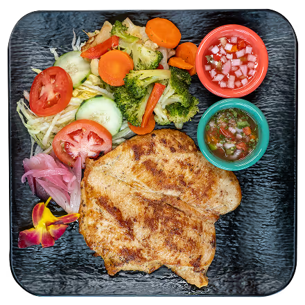 Beyond lunch, our main dishes highlight a different expression of latin chicken through our grilled chicken breast. Seasoned in Zona Caribbean style, this dish focuses on clean, savory flavor. It’s served with pico de gallo, grilled vegetables, and a house salad, making it lighter. Guests can choose between small and large portions, depending on their appetite.